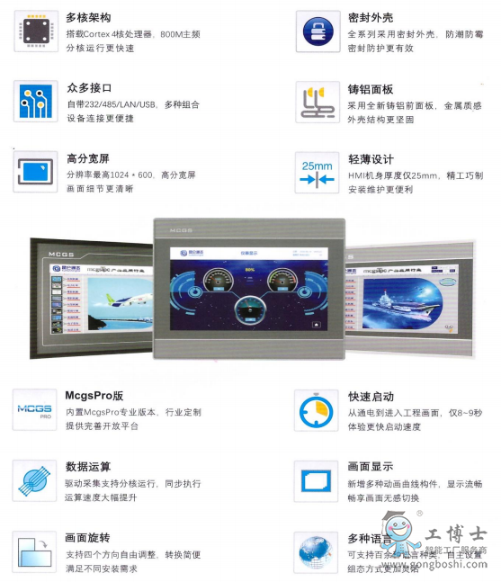 TPC1032Ki是昆侖通態推出的以嵌入式低功耗CPU為核心(Cortex-A7 4核 800MHZ)的高性能嵌入式一體化觸摸屏。該產品設計采用了7英寸高亮度TFT液晶顯示屏(分辨率800×480),四線電阻式觸摸屏(顯示亮度300cd/m³)。全新的TPC1032Ki,秉承了昆侖通態K系列產品一貫的優良品質。精巧的機身,尺度7英寸液晶顯示屏,更小的裝置控件,不變的顯示質量:搭載全新的 MCGS 嵌入版組態軟件(有報警、配方經常使用功能,無數據存儲功能,無堅持初始值功能)。全新的產品,帶給您更高的性價比。