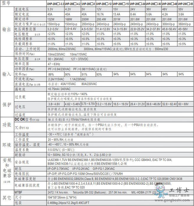由于UHP-1000強(qiáng)大與多元的控制接口與彈性化散熱接口選擇,產(chǎn)品應(yīng)用范圍非常廣泛,可以從一般工控恒壓到充電恒流應(yīng)用。半灌膠設(shè)計(jì)使UHP-1000成為堅(jiān)固、纖薄的無(wú)風(fēng)扇電源,也可抵抗震動(dòng)和灰塵的進(jìn)入,并具有相當(dāng)長(zhǎng)的使用壽命。符合IEC / EN / UL 62368-1的國(guó)際安規(guī)要求,并可根據(jù)客戶需求提供EN61558-1和家庭安規(guī)EN60335-1的申請(qǐng)。除了可以在-30℃ ~ +70℃的寬溫度范圍內(nèi)工作,并能用在全范圍的AC輸入電源,同時(shí)也可在5000m的高海拔區(qū)域操作。另外,UHP-1000 有12V、24V、36V和48V四個(gè)機(jī)型,輸出電壓范圍寬廣,可以適用于各種系統(tǒng)。