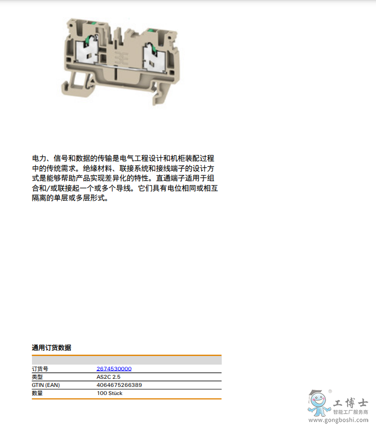 魏德米勒weidmulle直通型接線端子AS2C 2.5訂貨號2674530000