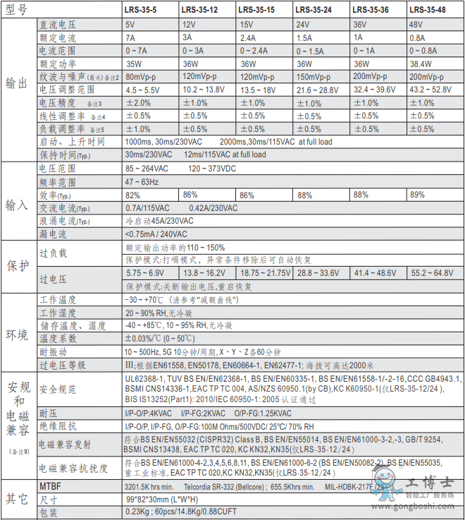 除了效率高達89%,金屬網外殼的設計加強了散熱能力使LRS-35在沒有風扇的情況下工作在-30℃到+70℃的溫度范圍內。提供超低空載功耗(小于0.2W),能使終端系統很容易滿足國際能源要求。LRS-35有完整的保護功能和抗5G振動能力;它符合 TUV BS EN/EN62368-1,BS EN/EN60335-1,BS EN/EN61558-1/-2-16,UL62368-1和GB4943國際安全法規,LRS-35系列為各種工業應用提供了一個高性價比的解決方案。
