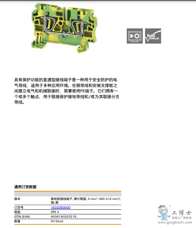Weidmuller ZPE 4 魏德米勒 直通型接線端子 訂貨號1632080000