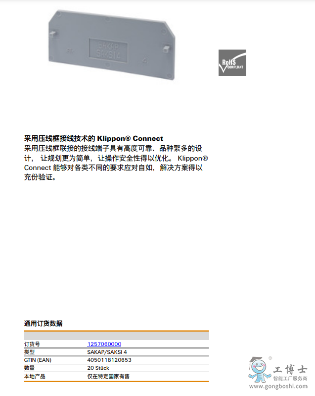 Weidmuller SAKAP/SAKS 4 魏德米勒 端子隔板 訂貨號1257060000