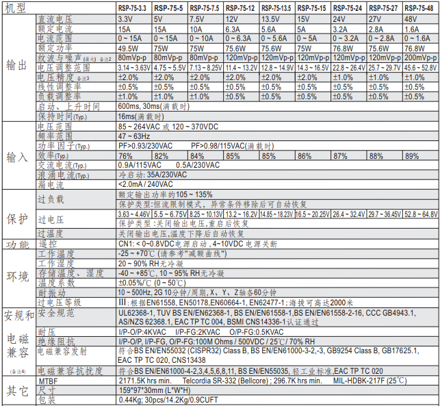 RSP-75是一款75W單組輸出機殼型交流變直流電源供應器。整系列輸入電壓范圍為85~264VAC,并且能提供可滿足大部分工業需求的直流輸出。每個機型可自然風冷,工作溫度達到70℃。