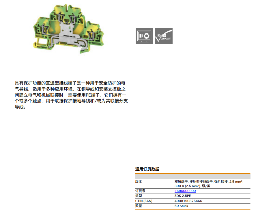 Weidmuller SAKDK2.5PE 魏德米勒 接地型接線端子 訂貨號1690000000