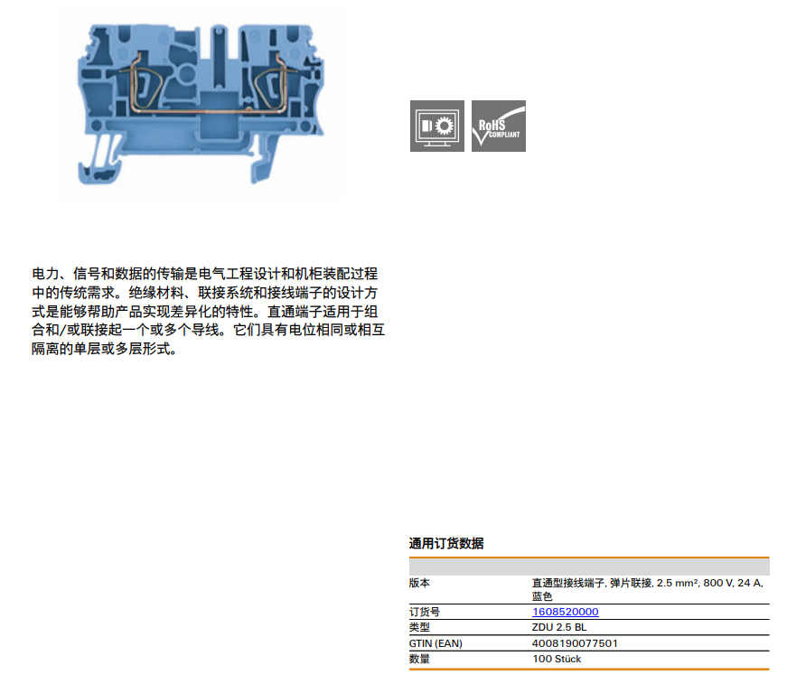 Weidmuller ZDU 2.5 BL 魏德米勒 直通型接線端子 訂貨號(hào)1608520000