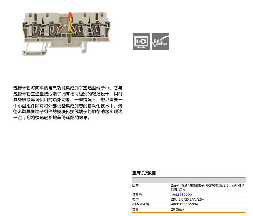 Weidmuller ZDU 2.5/2X2AN/LD+ 魏德米勒帶電子元件的模塊化接線端子