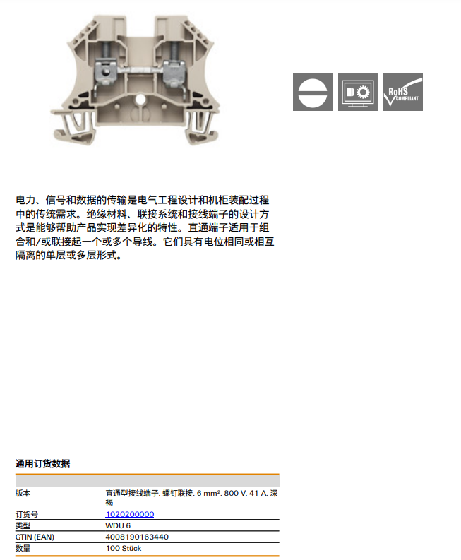 Weidmuller WDU 6 魏德米勒 直通型接線端子 訂貨號1020200000