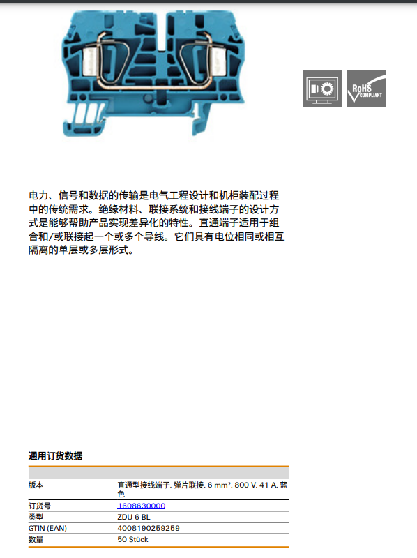 Weidmuller ZDU 6 BL 魏德米勒 直通型接線端子 訂貨號1608630000