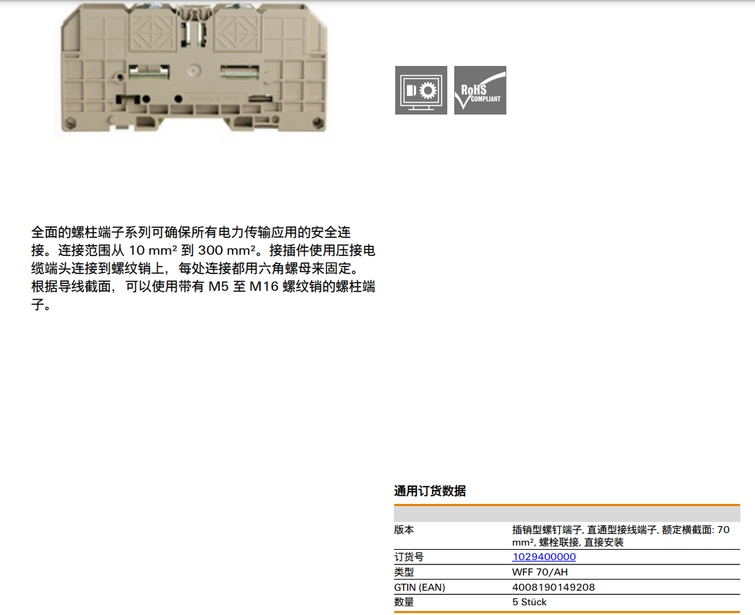 Weidmuller WFF 70/AH 魏德米勒 插銷型螺釘端子 訂貨號1029400000