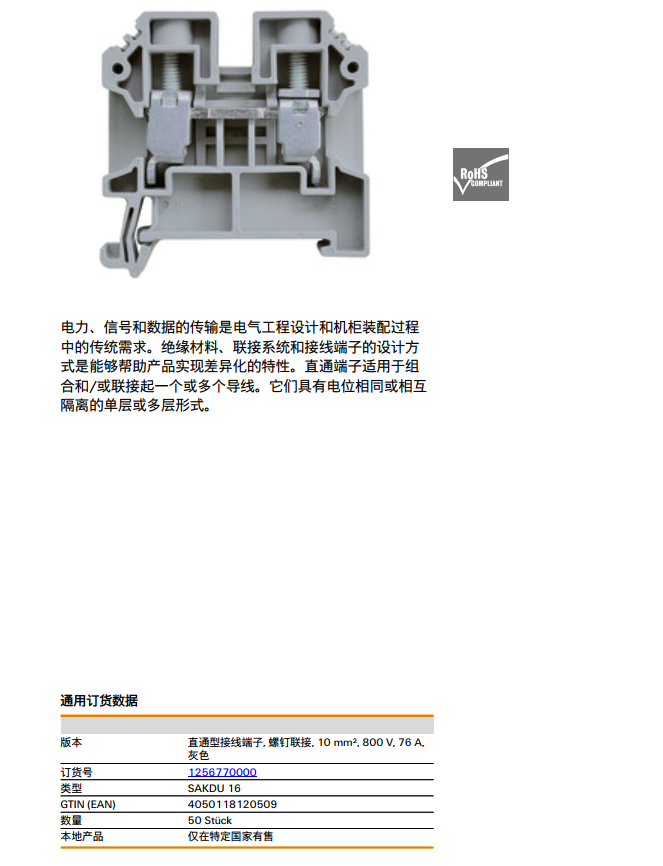 Weidmuller SAKDU 16 魏德米勒 直通型接線端子 訂貨號1256770000