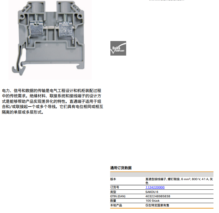 Weidmuller SAKDU 6 魏德米勒 直通型接線端子 訂貨號1124220000