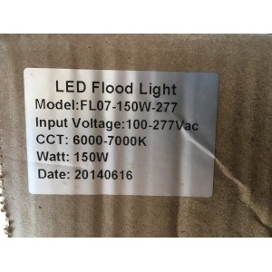 | 2 | LED Flood light | LED Flood light, model FL07-150W-277, Input voltage: 100-277 Vac, CCT: 6000-7000k, Wallt:150W. | FL07-150W-277 | EA | 1 |