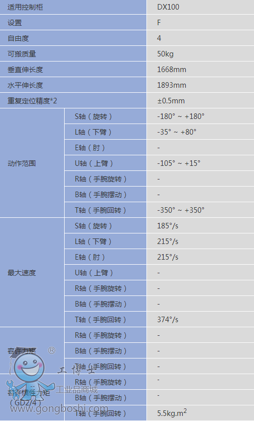 6軸垂直多關節 負載:50Kg 動態范圍:1893mm 控制柜:DX100 用途:搬運、取件/包裝、碼垛 中型負載,強化碼垛功能 全軸低功率輸出,無需設置安全柵欄,設備構成簡易
