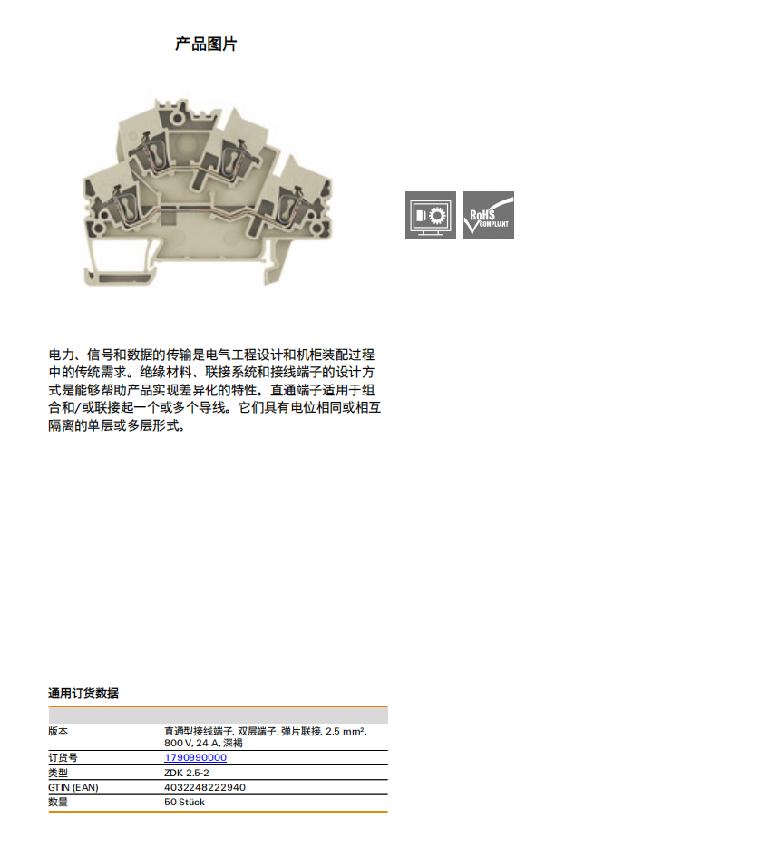 Weidmuller ZDK 2.5-2 魏德米勒 直通型接線端子 訂貨號1790990000