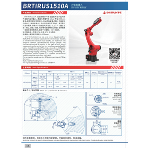 BRTIRUS1510A type robot developed for complex applications. The maximum load is 10KG, the maximum arm length is 1500mm. Suitable for painting, welding, molding, stamping, forging, handling, loading, assembling, etc. The protection grade reaches IP54. The repeatability is ± 0.05mm. It is suitable for injection molding machine range from 200Tonto600Ton.