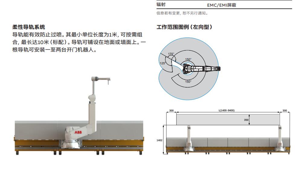 結構緊湊,靈活安裝 IRB 5350配套緊湊型手臂、底座和導軌系統,擁有如下優 勢: • 可輕松“嵌入”狹小的噴房; • 專用導軌系統增強噴涂機器人柔性; • 噴房兩側作業采用通用解決方案,第二軸工作范圍調 整方便; • 導軌系統支持落地式安裝。