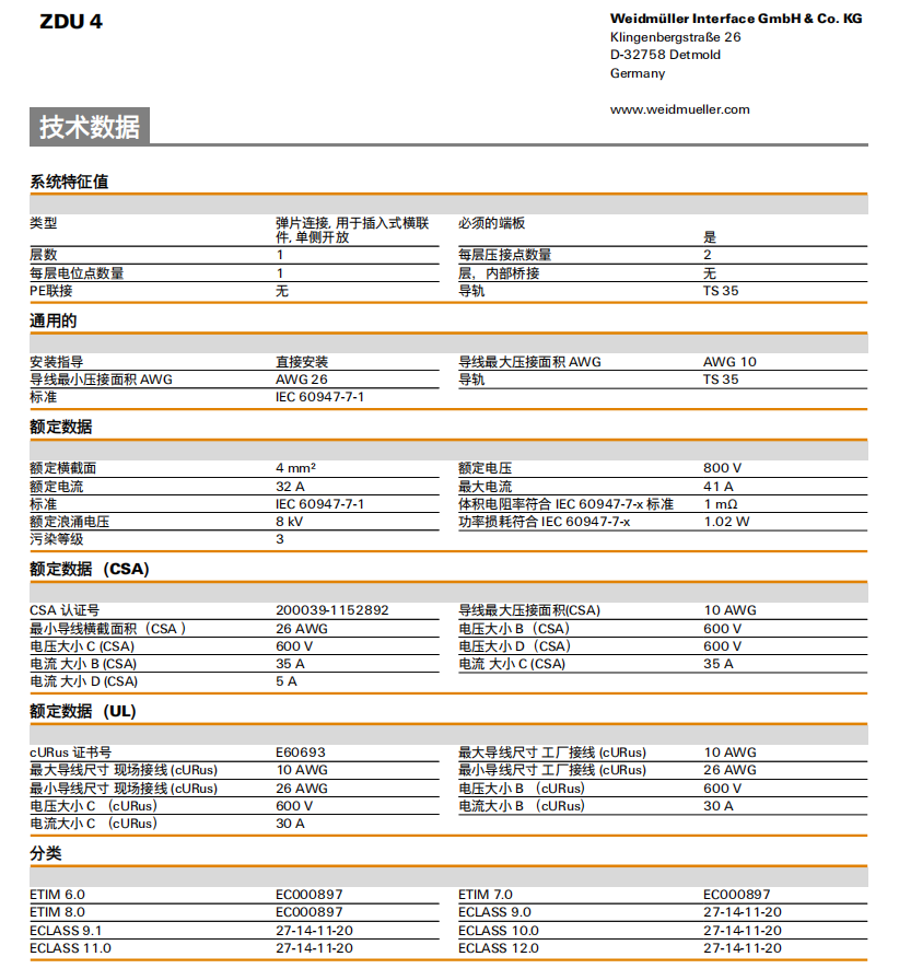 Weidmuller ZDU 4 魏德米勒 直通型接線端子 訂貨號1632050000