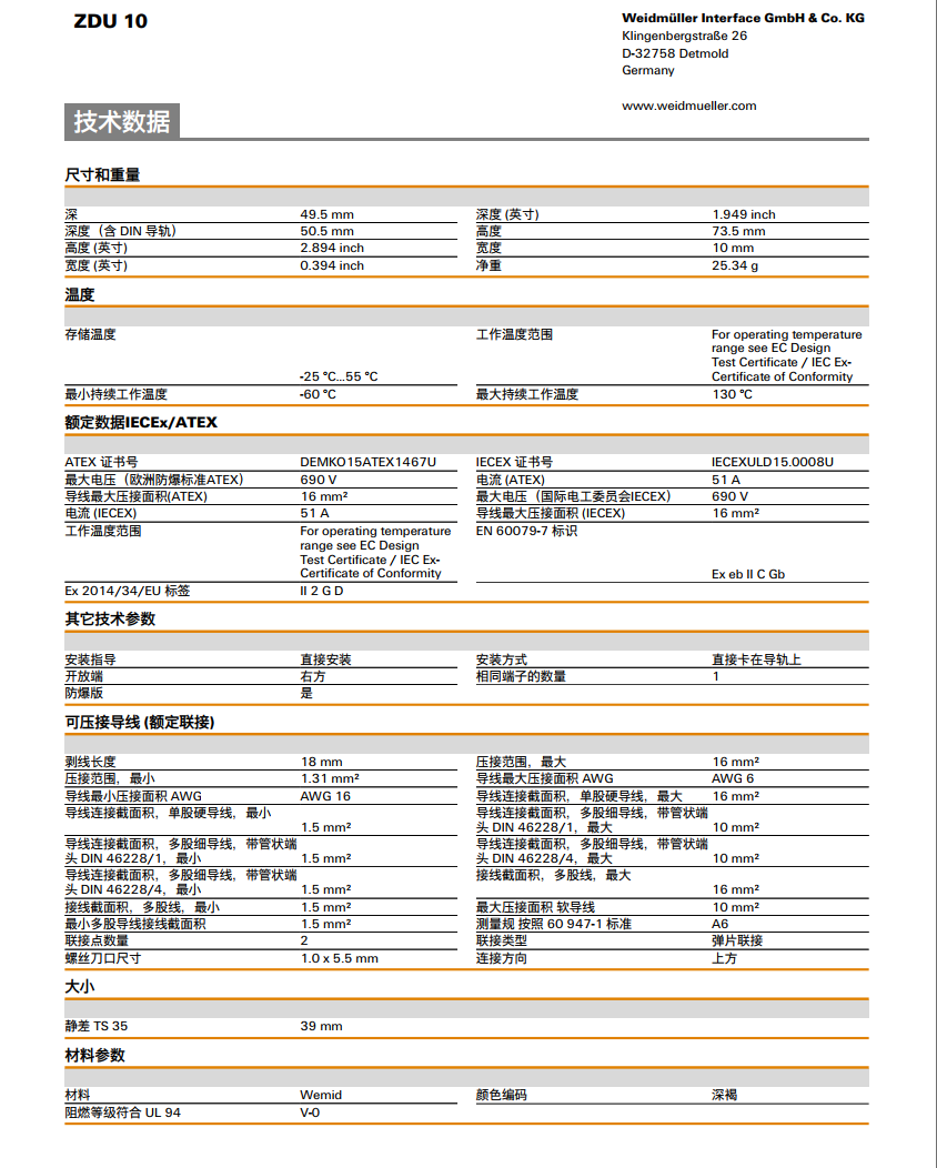 Weidmuller ZDU 10 魏德米勒 直通型接線端子 訂貨號1746750000