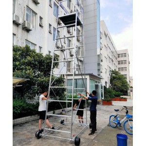 梯車(車梯)選用高強度鋁合金材料制造,型材截面設(shè)計合理,重量輕,車梯底架用鋼管制造,保證底架的穩(wěn)定性和安全性,不變形。車輪為稀土尼龍輪強度高、運轉(zhuǎn)無噪音、絕緣性能好,其中有一車輪鑲嵌鋼環(huán),解決安全接地問題。