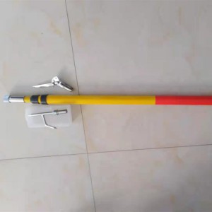 接觸網挑異物桿、雜物桿是用來清除掛在供電線路上的異物(如樹枝 塑料袋 風箏等)的專用工具,其功能可以挑、鉤、鋸、打。該工具用環氧樹脂玻璃纖維管材料為桿身,絕緣性能好。重量輕,可以伸縮,攜帶方便,桿頭部刀據和鉤尖用不銹鋼或絕緣材料制作,不但防銹,而且鋒利。更換方便。伸縮機構是定位銷鎖緊,伸長時拉出,當拉到看見刻線時停住,而后左右轉動,轉到一定角度,定位銷會自動彈出,從而定位鎖緊,當收縮時用手指按下定位銷同時往里推內管即可縮短