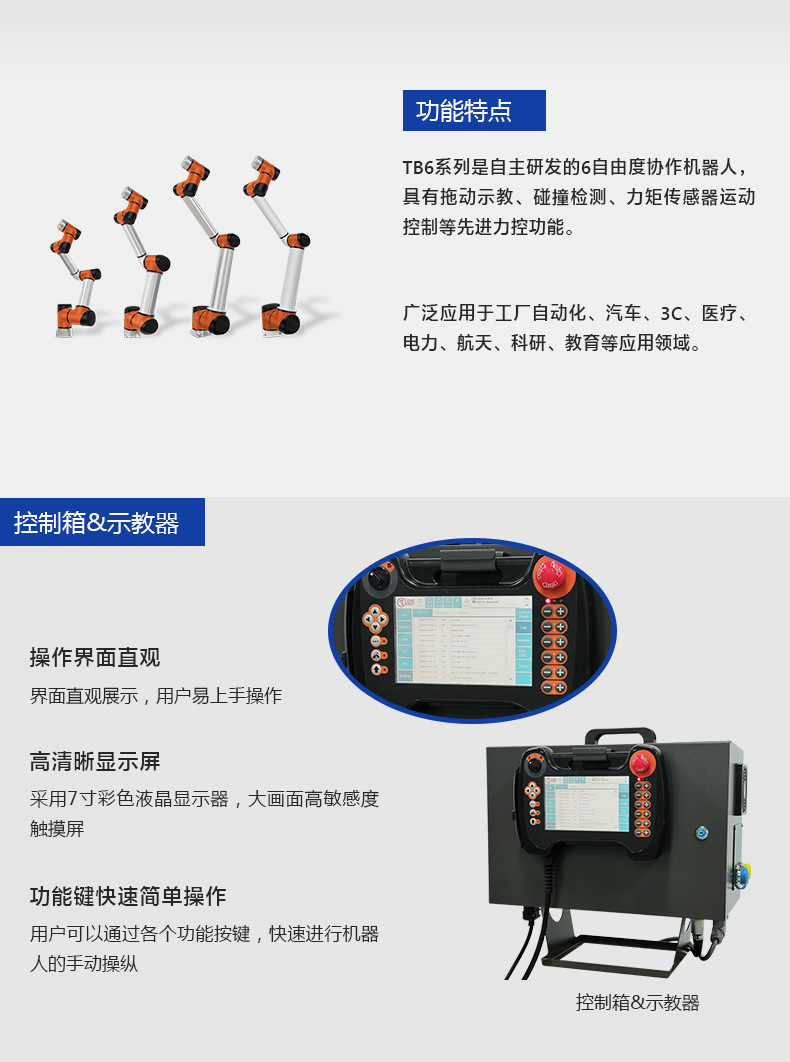 深圳泰科智能TB6系列協作機器人是泰科智能自主研發的6軸輕型協作機器人,具有拖動示教、安全防碰撞等功能,可以直接與人協同工作。采用自主設計研發RJSII系列關節模組,既輕便靈活、運行平滑柔順,同時滿足負荷的需求。防護等級高,可適用于更多苛刻的工作環境,既有強大的通用性、 協作性與開放性,廣泛應用于物流裝配、流水線生產、上下料、AGV、3C電子、科研、醫療、軍工、航空航天等行業領域。安裝簡單(安裝方式任意角度)及用途多樣化,提升產品品質和生產效率,并更好的節約人工成本。