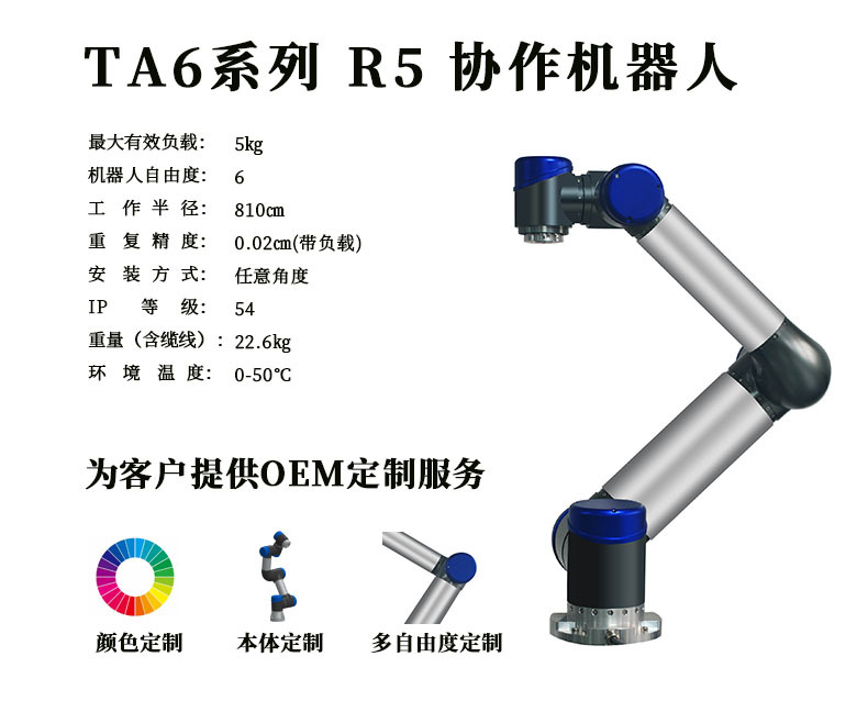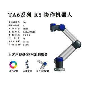 TA6-R5協(xié)作機器人是泰科智能自主研發(fā)的6自由度的協(xié)作機器人,具有拖動示教、安全防碰撞等功能,可以直接與人協(xié)同工作。 采用自主設(shè)計的RJS系列關(guān)節(jié)模組,既輕便靈活、運行平滑柔順,同時滿足負荷的需求。既有強大的通用性、 協(xié)作性與開放性,適用于物流裝配、流水線生產(chǎn)、上下料、AGV、3C電子、科研、醫(yī)療等行業(yè)。TA6系列協(xié)作機器人安裝簡單(安裝方式任意角度)及用途多樣化,不管您是什么行業(yè)或者產(chǎn)品,都可以很好的融入到各個生產(chǎn)流程,提升您工廠的生產(chǎn)效率,并更好的節(jié)約人工成本。