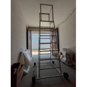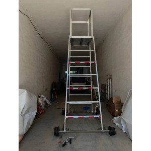 梯車(車梯)選用高強度鋁合金材料制造,型材截面設計合理,重量輕,車梯底架用鋼管制造,保證底架的穩定性和安全性,不變形。車輪為稀土尼龍輪強度高、運轉無噪音、絕緣性能好,其中有一車輪鑲嵌鋼環,解決安全接地問題。