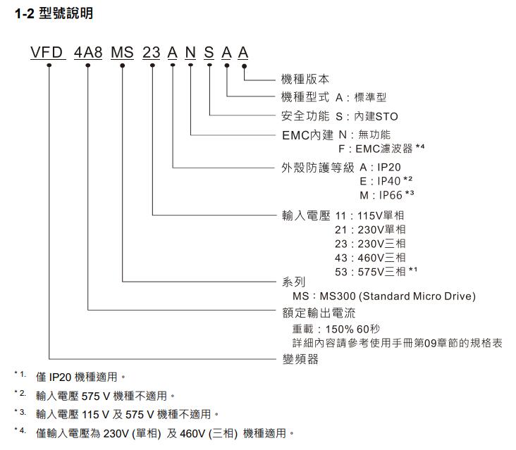 VFD4A2MS43AFSAA 3P460V,1.5kW,IP20,內置剎車單元,內置濾波器(C2 Class),內置PLC