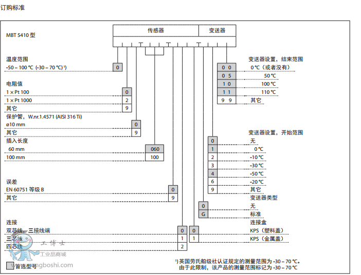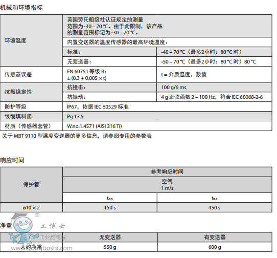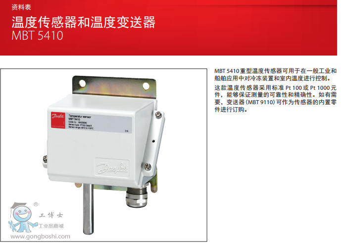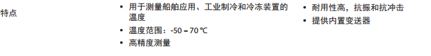 MBT 5410 是一款重工況溫度傳感器,可用于控制常規(guī)工業(yè)和海上應(yīng)用中的冷凍系統(tǒng)和室內(nèi)溫度。該溫度傳感器采用標(biāo)準(zhǔn)的 Pt100 或 Pt1000 元件,后者可以實現(xiàn)可靠的高精度測量。如果需要,也可以提供內(nèi)置變送器 (MBT 9110)的類型。 溫度范圍 -50 到 100°C 測量精度高 結(jié)構(gòu)牢靠,抗沖擊,抗振動 可以配備通過或未通過 Eex ia IIC T4/T6 認(rèn)證的內(nèi)置變送器 帶或不帶流電絕緣功能 可以符合所有相關(guān)的海上應(yīng)用認(rèn)證