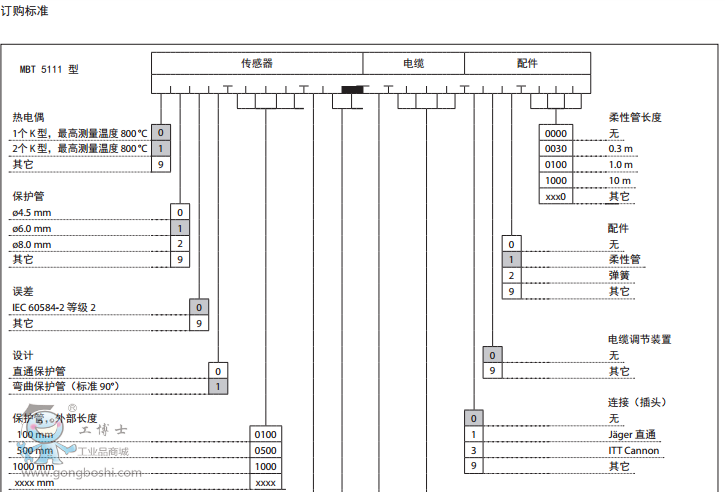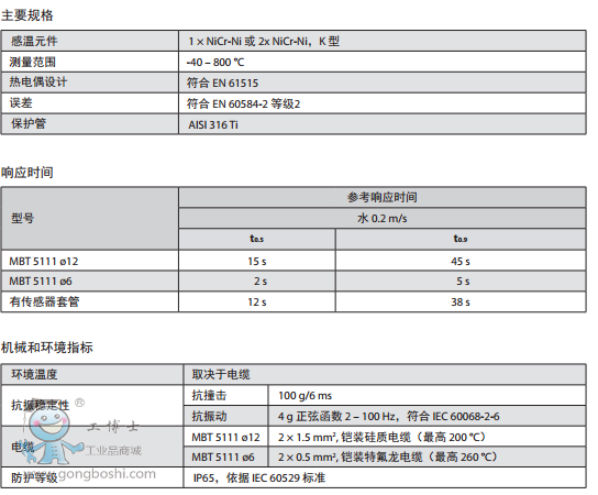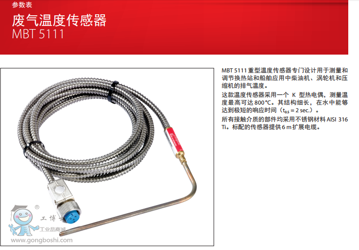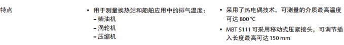 MBT 5111 是一款重工況溫度傳感器,可用于測量和控制固定設施及海上應用中的柴油發動機、渦輪以及壓縮機排出的尾氣。該溫度傳感器采用 K 型熱電耦,可以測量 800°C 的高溫。其纖細型結構使得反應時間極短(在水中的 t0,5 = 15 秒)。所有與介質接觸的部件均用 AISI 316 Ti 不銹鋼制造。 該傳感器標配一條 6 m 長的補償電纜。 熱電偶可以測量高達 800°C 的介質溫度 插入長度可調節,使用活動壓接頭可使插入長度達到 150 mm 固定傳感器芯 可以符合所有相關的海上應用認證