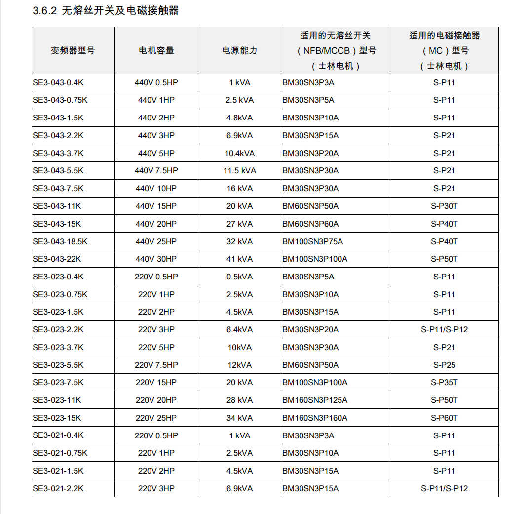 士林變頻器SE3系列產品型號;
