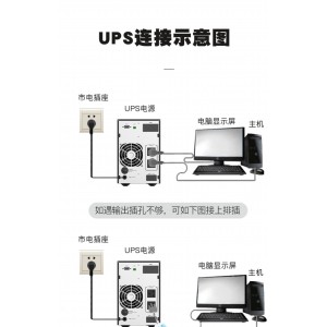 UPS是不間斷電源的一種,在停電時能自動輸送220V穩(wěn)定電源。一般用于電腦和照明設備。連接方式:UPS上的三插頭插座插入墻壁開關,UPS后面的三插頭插座連接電腦的電源插頭,使電腦進入自動保護關機狀態(tài)。