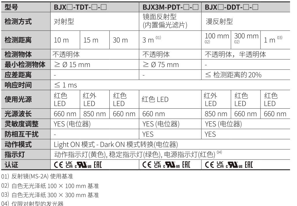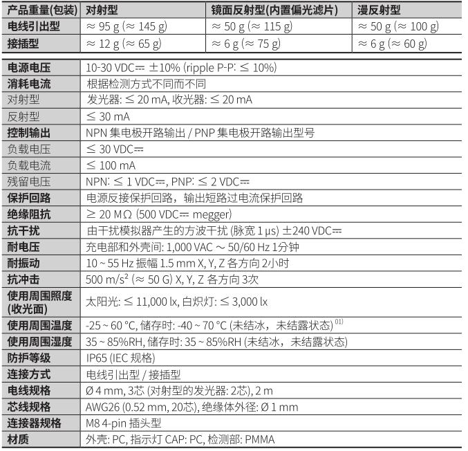 :對射型30m,漫反射型1m,鏡面反射型(內置偏光濾片)3m(MS-2A)·內置M.S.R.(MirrorSurfaceRejection)功能(鏡面反射型(內置偏光濾片))