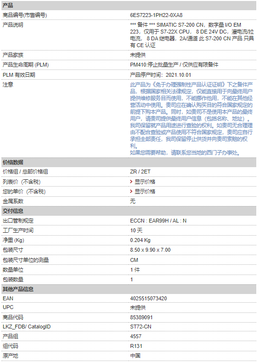 西門子PLC 6ES7223-1PH22-0XA8 S7-200 CN 數字量 I/O EM 223