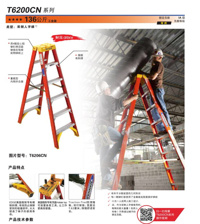 穩(wěn)耐WERNER玻璃鋼雙側(cè)人字梯3.1米絕緣梯子T6210CN---穩(wěn)耐梯子