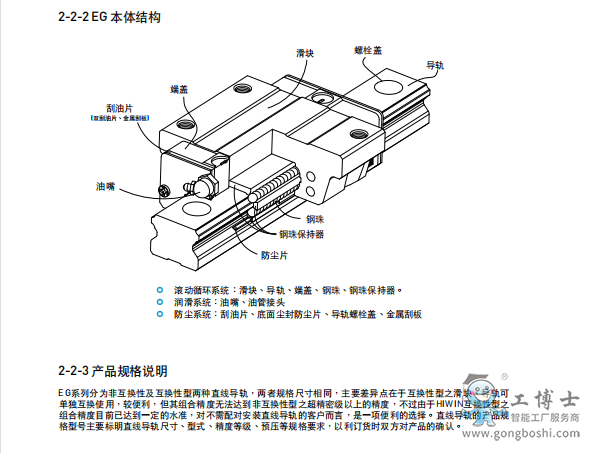 EG系列使用四列鋼珠承受負荷設計,使其具備高剛性、高負荷的特性,同時具備四方向等負載特色、及自動調