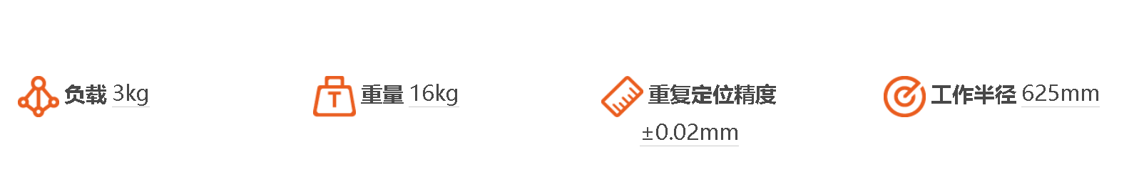 負(fù)載3kg,臂展782mm,***大工作半徑625mm