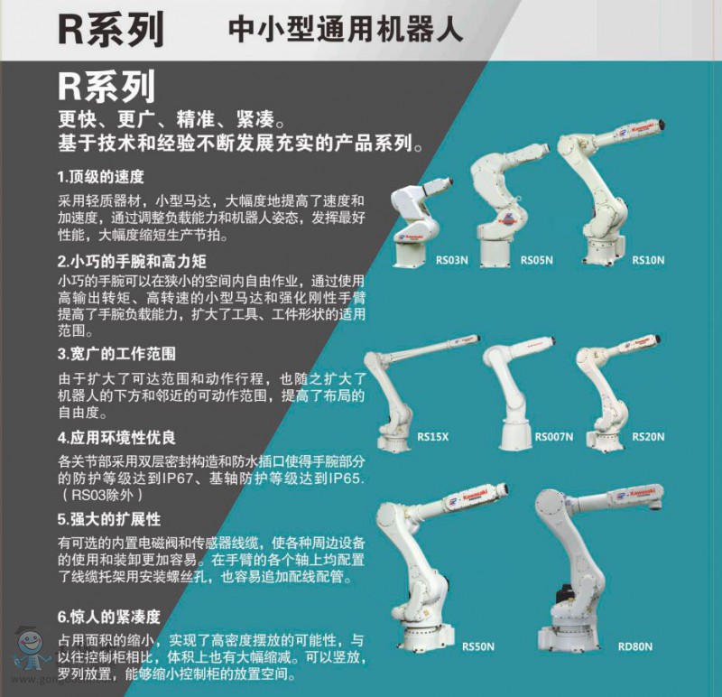 R系列機器人為所有小中型工業機器人設定了基準。緊湊的設計和業界**的速度、伸展距離和工作范圍使R系列機器人適用于遍及眾多不同行業的廣泛應用范圍。擁有3,150mm的系列*大動作范圍。