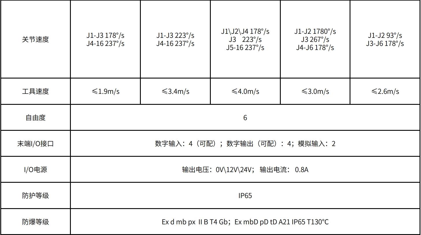 防爆系列協作機器人 GFB防爆系列協作機器人具有3-16kg不同負載能力,是一款為滿足更高防護標準的工作環境 需求而開發的擁有高安全性防爆技術的協作機器人產品。 適用領域 石油 化學工業 醫藥 噴涂 軍工 特性優點 安全可靠 高精度 系統開放 簡單易用 GBS FB-i3 負載:3kg 重量:16kg 重復精度:±0.02mm 工作半徑:625mm GBS FB-i5 負載:5kg 重量:24kg 重復精度:±0.02mm 工作半徑:886.5mm GBS FB-i10 負載:10kg 重量:38.5kg 重復精度:±0.03mm 工作半徑:1350mm GBS FB-i16 負載:16kg 重量:38kg 重復精度:±0.03mm 工作半徑:967.5mm GBS FB-i20 負載:20kg 重量:63kg 重復精度:±0.1mm 工作半徑:1650mm