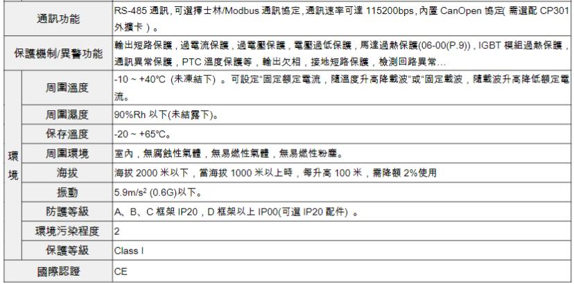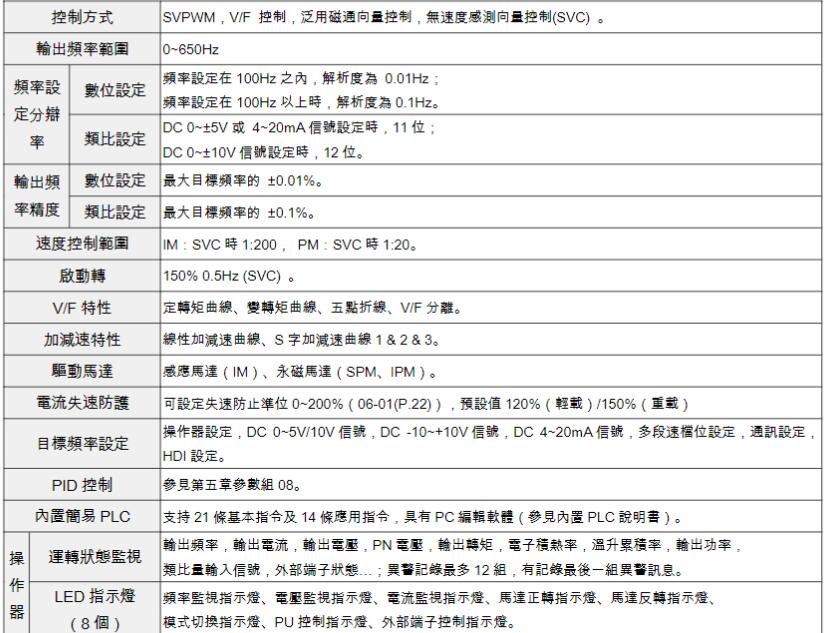 2. 高啟動轉(zhuǎn)矩: 無感測向量控制(SVC)150% 0.5Hz