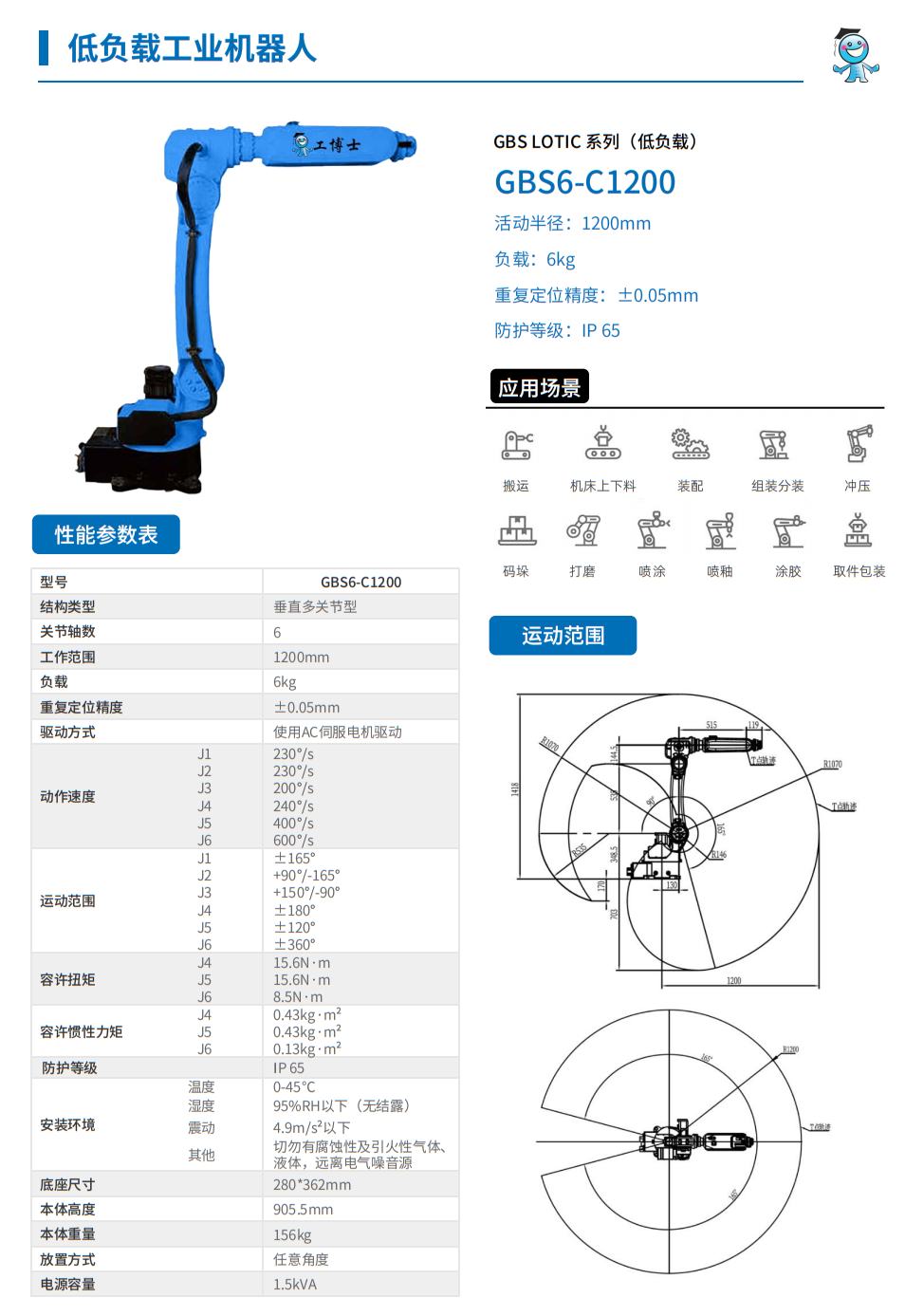 工博士機器人 GBS LOTIC系列(低負載)GBS6-C1200 負載6kg 臂展1200mm