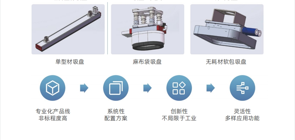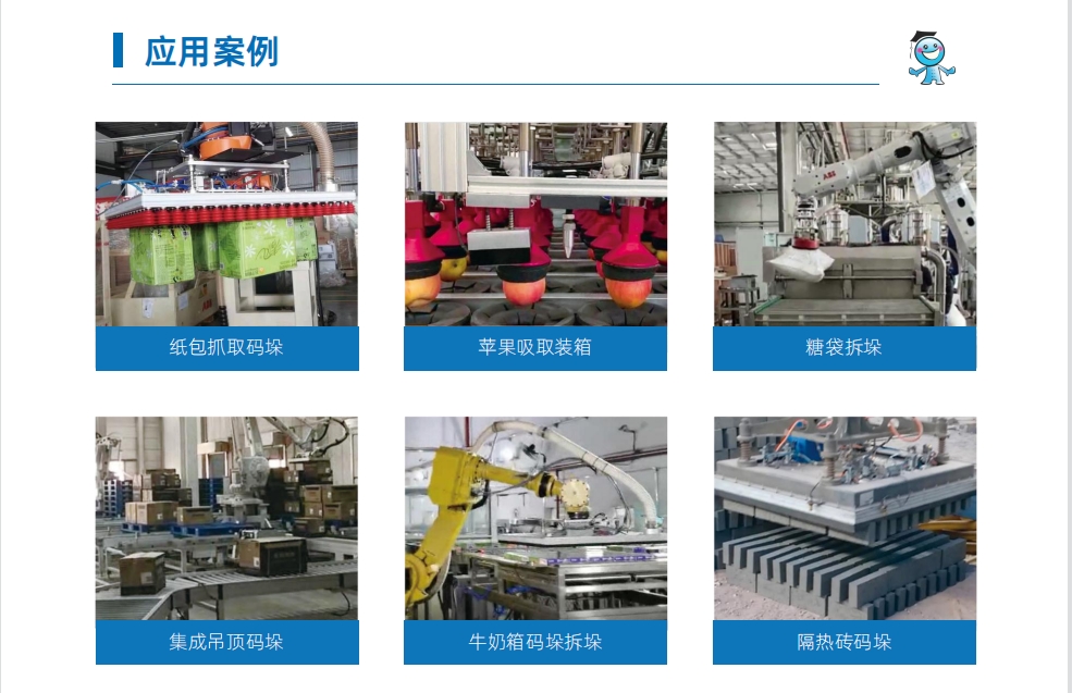 工博士真空吸盤系統致力于真空搬運技術在堆垛、拆垛、搬運、裝箱等不同應用領域,為