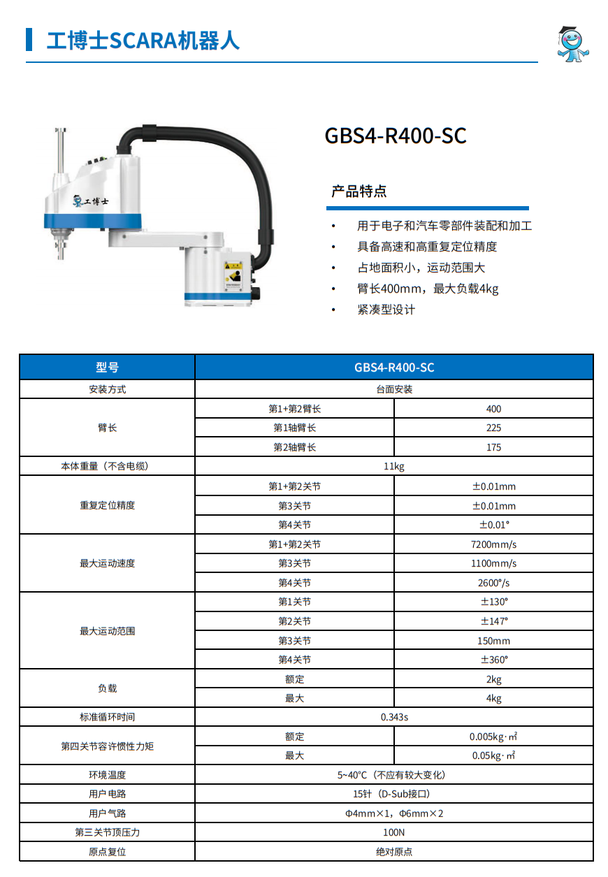 工博士SCARA機器人 GBS4-R400-SC 負載:4kg 臂長:400mm