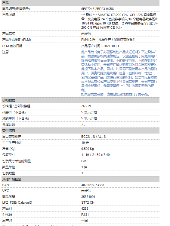 西門子plc模塊6ES7216-2BD23-0XB8 S7-200CN CPU 22模塊