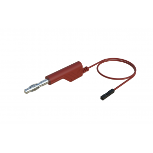 Umspritzte Messleitung mit gefedertem 4 mm Stecker und 4 mm Buchse zur Weitersteckung und einer isolierten Buchse für Rundpfosten 0,64 mm und Rechteckpfosten 0,64 mm. Hochflexible Litzenleitung 0,25 mm². |