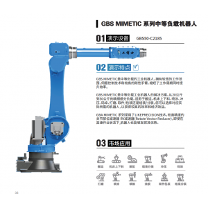 GBS MIMETIC是中等負載的工業機器人,擁有較寬的工作范圍,伺服控制技術和較高的剛性手臂,縮短了工作周期同時提