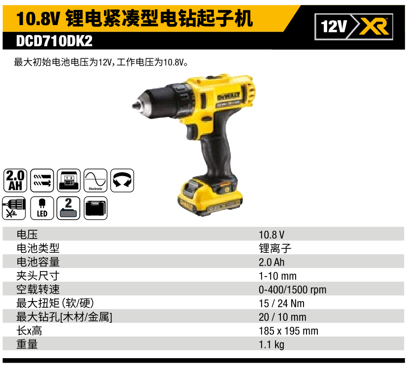 得偉(Dewalt)10.8V 鋰電緊湊型電鉆起子機(jī)DCD710DK2