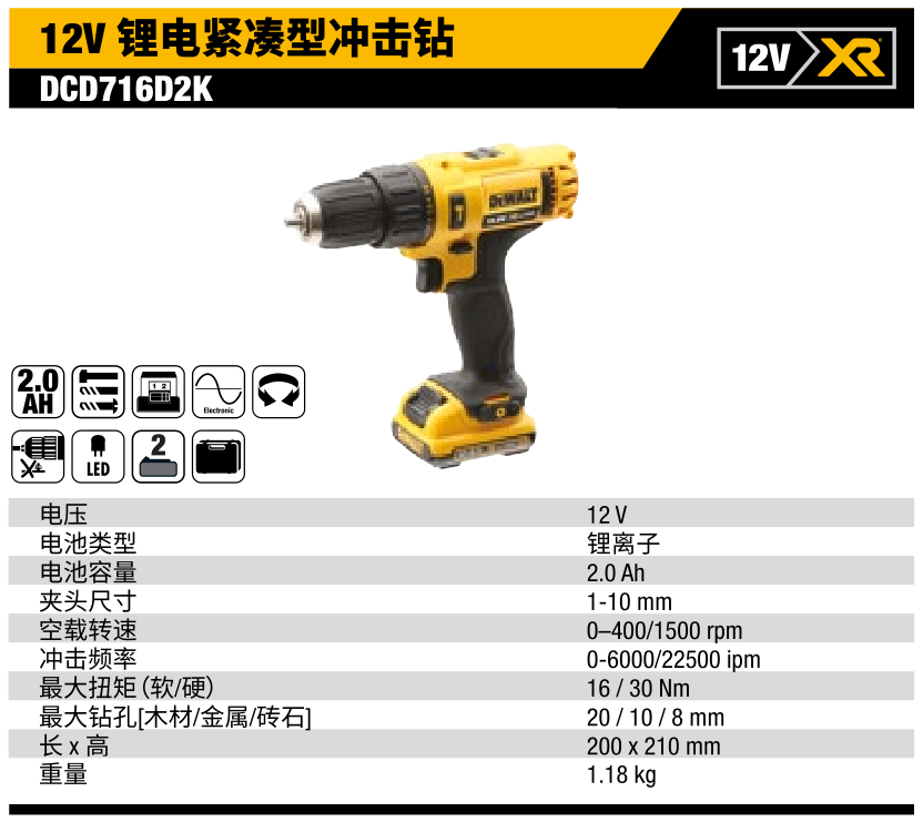 得偉(Dewalt)12V 鋰電緊湊型沖擊鉆DCD716D2K