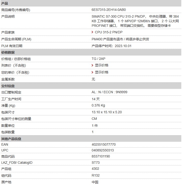 西門(mén)子 S7-300 CPU 315-2 PN/DP 6ES7315-2EH14-0AB0