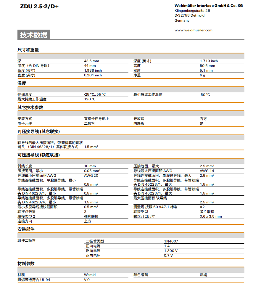 魏德米勒 ZDU 2.5-2/D+ 直通型接線端子 訂貨號1779110000